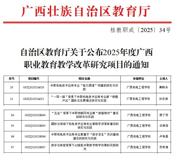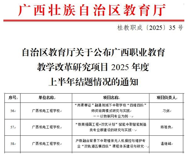 近日,2025年度广西职业教育教学改革研究项目评审结果公布,学校在立项、结题环节喜获双丰收,再次彰显了学校教科研实力。
