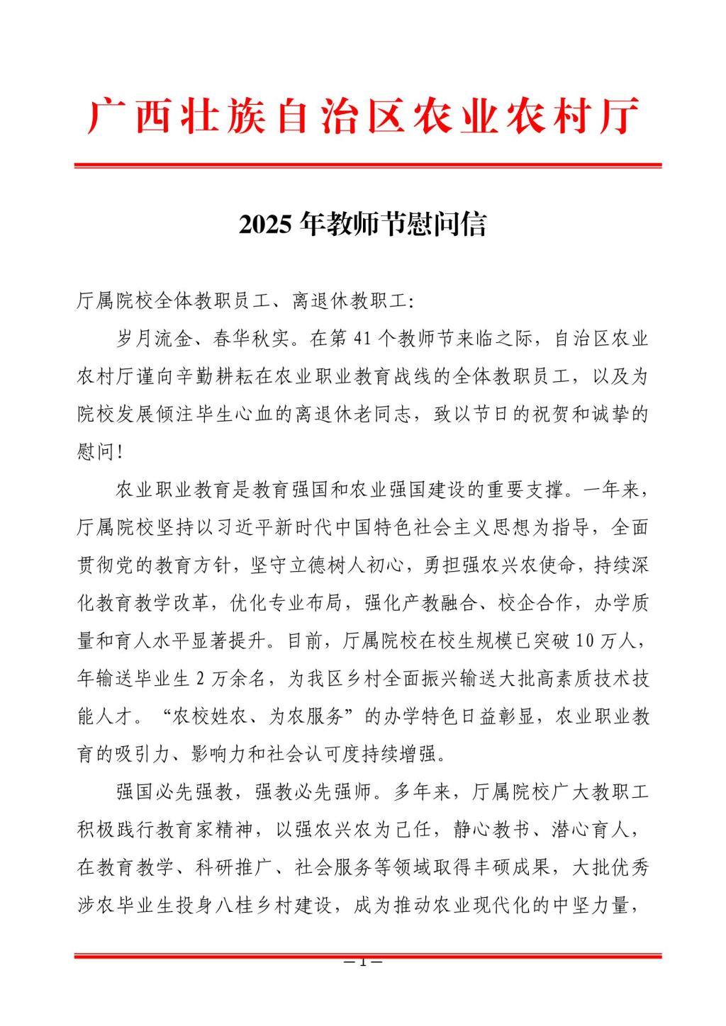 通讯员 凌彩梅在第41个教师节即将到来之际,2025年9月8日上午,自治区农业农村厅党组副书记、副厅长吴朝晖一行莅临学校开展教师节慰问活动。吴朝晖代表自治区农业农村厅...